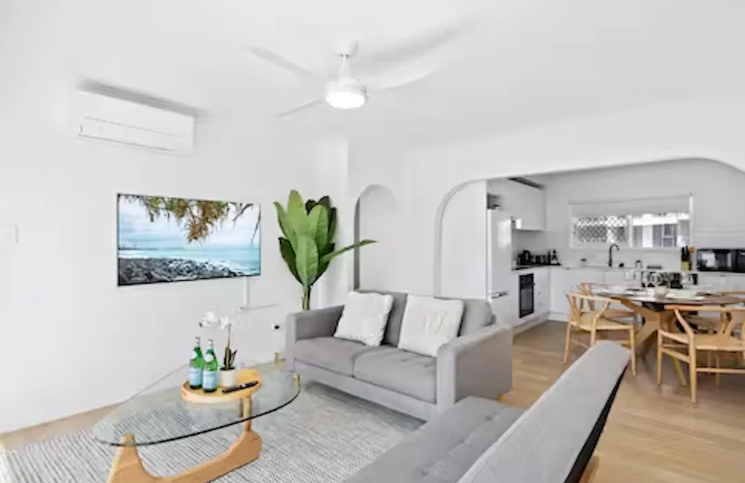 Beachfront Escape Broadbeach - 2Bd, Pool, Sleeps 7 apartment includes a balcony and a sitting area with air conditioning for utmost comfort. This apartment is equipped with a bathroom that features dryers and towels. You'll also come across a separate toilet and a shower.